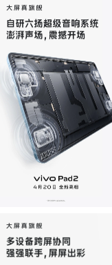 今天 vivo 官方公布了 vivo Pad 2 平板电脑的更多配置信息。该旗舰平板电脑采用自研六扬超级音响系统,澎湃声场;支持多设备跨屏协同,与手机、电脑等联动;自研仿真书写引擎,真实有触感。