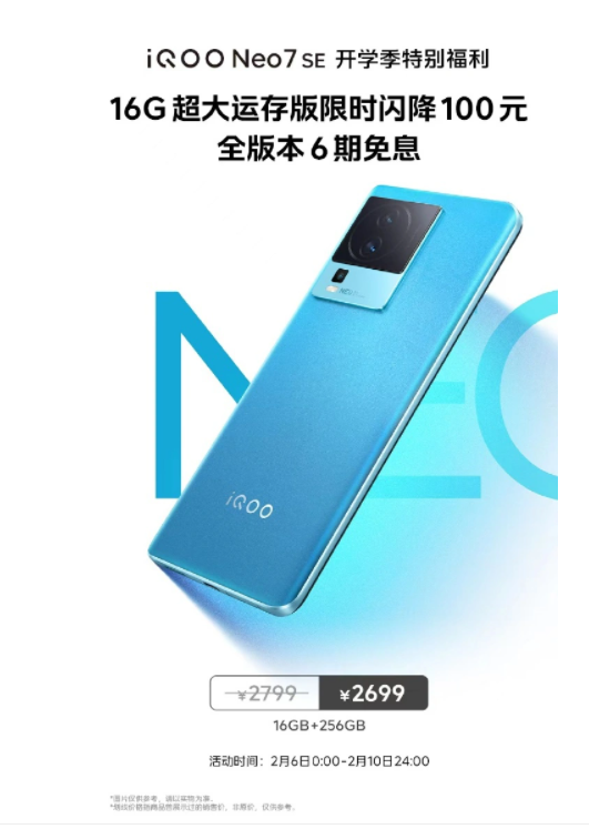 iQOO Neo7 SE 采用 6.78 英寸 120Hz 高刷柔性直屏,1000nit 全局最高亮度,8000000:1 对比度,1300nit 局部峰值亮度,支持 HDR 10 + 和 SGS 低蓝光认证;双 10 倍触控微操提升跟手性;体感操控支持竞速游戏;采用封闭式立体双扬声器 + 120° 声场拓宽算法,带来澎湃听音体验。采用 6400 万像素高清主摄,搭载 OIS 光学防抖,前置 1600 万像素镜头。