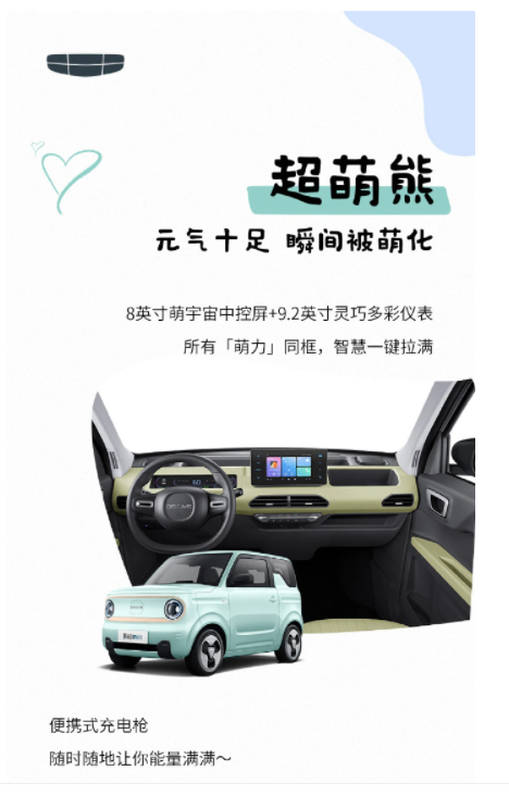 吉利在工信部申报的资料显示,熊猫 mini 将搭载最大功率为 30kW 的前置电动机,动力电池将由国轩高科提供磷酸铁锂电池。耐力熊支持 22kW 直流真快充,30 分钟即可从 30% 充到 80%。