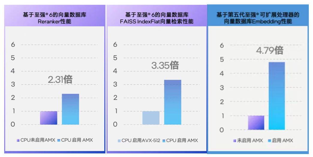一直被当成 “GPU 小跟班” 的机头 CPU,早不是“GPU忙死我旁观、算力大活我不担“的角色了,尤其是至强处理器开启AMX技术的支持后——英特尔近期就在多个与客户及合作伙伴沟通的场合中披露了向量数据库上的多个测试数据,如:在至强®6性能核处理器上,开启AMX进行加速后, FAISS IndexFlat向量检索性能提升达3.35倍,Reranker性能也会拉到未启用时的2.31倍。还有一组基于第五代至强可扩展处理器平台的测试数据:在激活AMX加速后,其上的向量数据库的Embedding性能也可拉到未开启时的4.79 倍。所有这些基于实战的数据都指向一点:至强CPU能帮GPU分担向量数据库的工作。