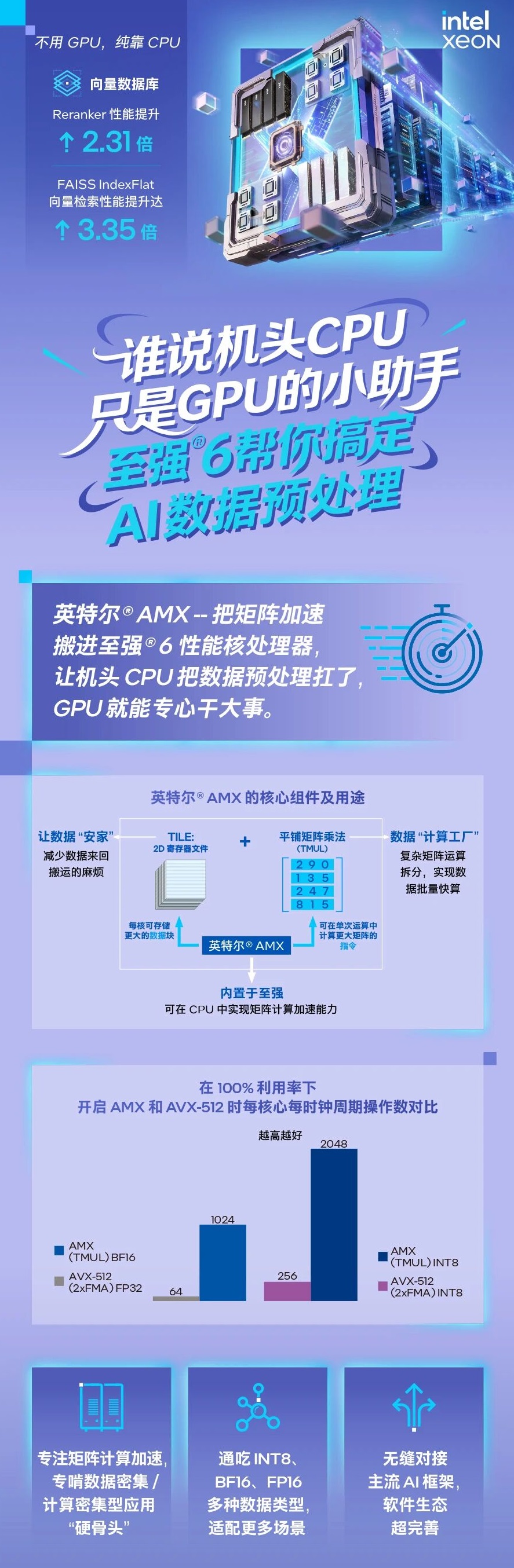 所以别再让你的至强 CPU在AI服务器中“发呆”了,用好它,让它真正做好协同的工作,能让整个 AI 流程跑得更快、更省、投资回报更丰厚。所谓:不能帮 GPU 加速向量数据库的 CPU,真算不上好至强。接下来随着 AMX 支持更多数据类型、至强兼容高带宽内存,相信这种 “协同力” 还会更强。想Get更多至强®6+AMX数据预处理“超能力”即刻访问英特尔官网揭晓。