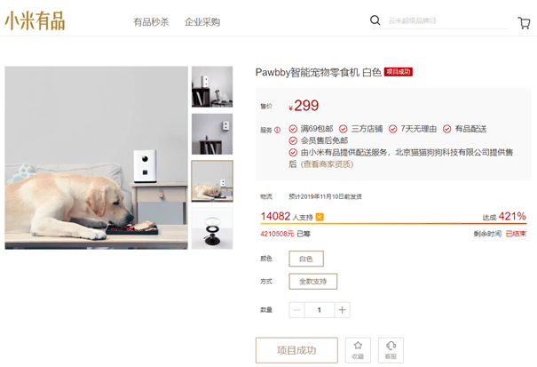 接受小米的投资后,PAWWBBY在2019年推出的智能宠物零食机新品在小米有品上进行了众筹,该众筹价为299元,获得了1.4万人的支持,达成率421%, 共筹集到了资金421万元。这个项目的成功,也再次表明了宠物用品智能化的趋势得到了市场的验证,是可行的。