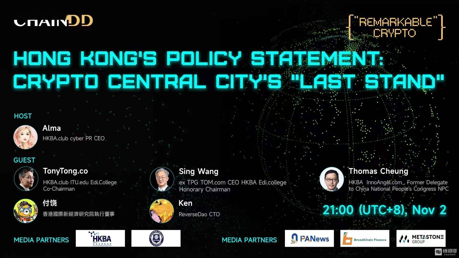北京时间11月2日21:00,ChainDD发起了活动,从香港的《宣言》看加密中心城的Web3行业前瞻,探寻香港人眼中的Web3前路。