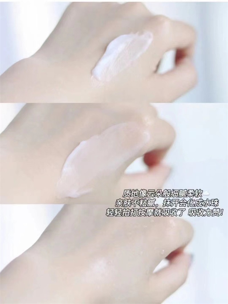 冰淇淋乳霜质地,很容易就能在脸上推开,稍微一按摩就噌地吸收了,透气不闷痘,也不用担心沾枕头,第二天直接洗脸即可。