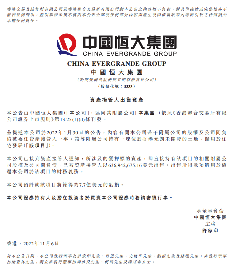 图片来源@视觉中国 文 | BT财经,作者 | 无忌 恒大的债权人开始动手了。 11月6日晚间,“躺平”许久的中国恒大(03333.HK,以下简称恒大)突然发布公告。公告称,恒大一块位于中国香港元朗拟用于住宅的未开发土地已被资产接管人出售,出售价格约6.369亿美元,预计亏损达到高于售价的7.7亿美元。 公告解释称,恒大此次出售所得款将用于偿还恒大在该项目的财务义务。据资料显示,恒大香港元朗项目的资产接管人,是美国不良资产管理企业橡树资本。 该地块为位于香港元朗的和生围项目,是恒大集团在2019年以47.5亿港元从恒基地产手中购入。根据规定,恒大方面需要先更改规划,再更改地契、补地价后,才可申请发展。恒大在该项目的前期投入不菲。在补完地价之后,恒大在该项目的总成本已超过89亿港元。 有媒体观点称,恒大目前处于风雨飘摇中,前面的债务重组仍未取得积极进展,现在不少债权人通过处置质押物来挽回损失,恒大最大的问题是还有多少资产可以出售? 事实真是如此吗?