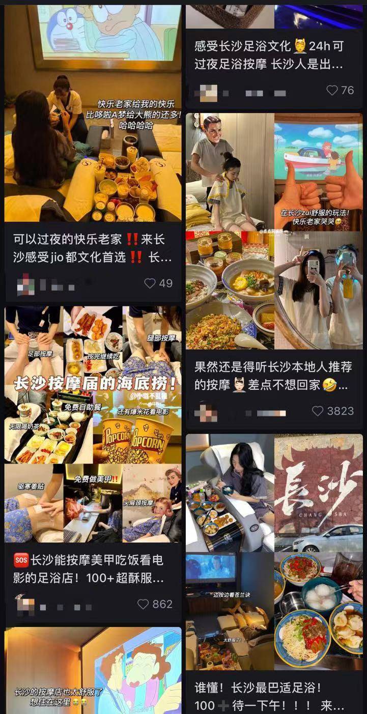 网友分享的洗脚城自助美食(图源:社交媒体截图) 装修和技术上相互比拼是常规操作,有实力的足疗店除了按摩的房间,有KTV、台球桌、桌游吧,甚至还有可以敞开肚皮吃的自助美食。在社交媒体上搜长沙洗脚城的攻略,占据版面最多的,永远是九宫格都摆不下的食物。 “长沙本地有种说法,最地道的小吃,都大隐隐于洗脚店里。”在长沙工作两年多,从事娱乐营销行业的湘漂一族小运在接受时代周报记者采访时说道。 根据小运的介绍,长沙的洗脚城就是足浴界的海底捞。“去到现场,在装修华丽的大厅里,摆满折叠桌椅,可以看到有很多人在一脸享受的嗦着牛肉粉。” 号称长沙最好吃的牛肉粉,在洗脚店金色印象里,四喜富侨洗脚店里能吃到长沙数一数二的抄手馄饨。除此之外,还可以吃到卤粉煲仔饭、面条、饺子、凉皮等美食。 只有你想不到,没有洗脚城做不到的。