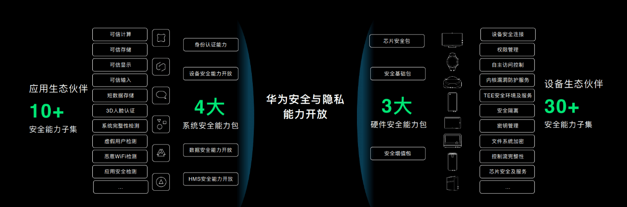 对此,华为方开放了4大安全能力包、10+安全能力子集,3大硬件安全能力包、30多个安全能力子集,让合作伙伴在华为的全场景生态中,生态设备获得HarmonyOS隐私安全能力加持,业务开展如虎添翼。