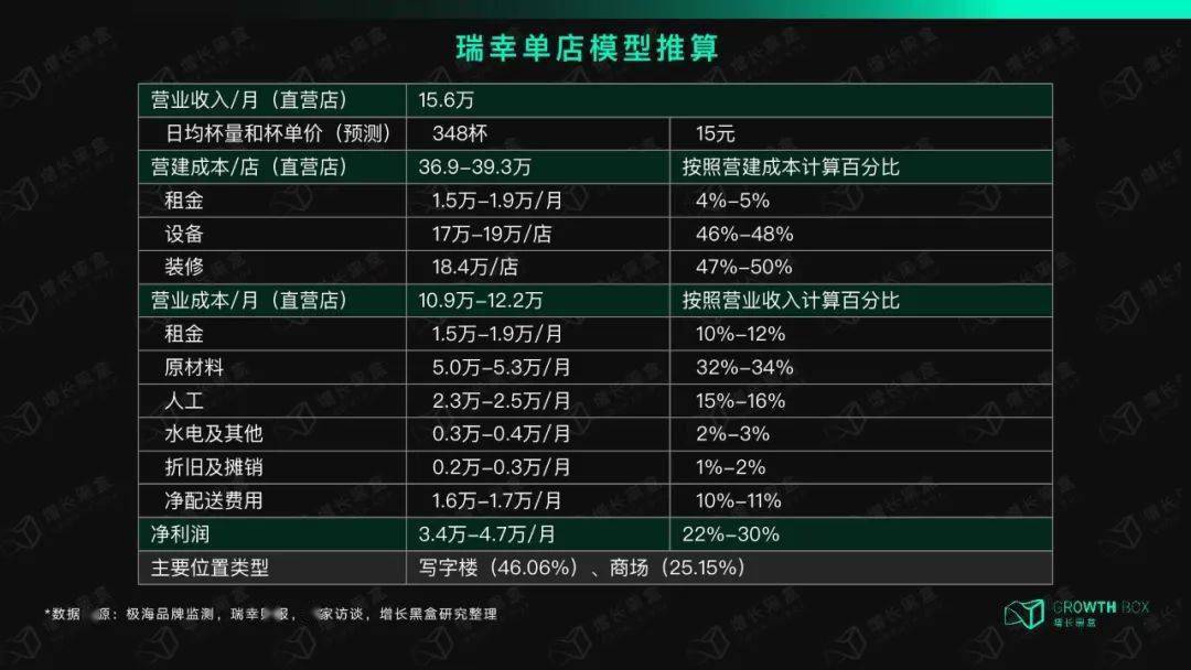从租金成本来看,瑞幸门店位置选择偏好写字楼底层,其次是商场角落位置,超过97%的店铺都是20-60平米的快取店,全国平均租金为1.5-1.9万/月,租金占营收的比例通常在10%上下。与此相比,星巴克、奈雪の茶等大店模型的品牌,租金占比通常在15%以上。[1][4]