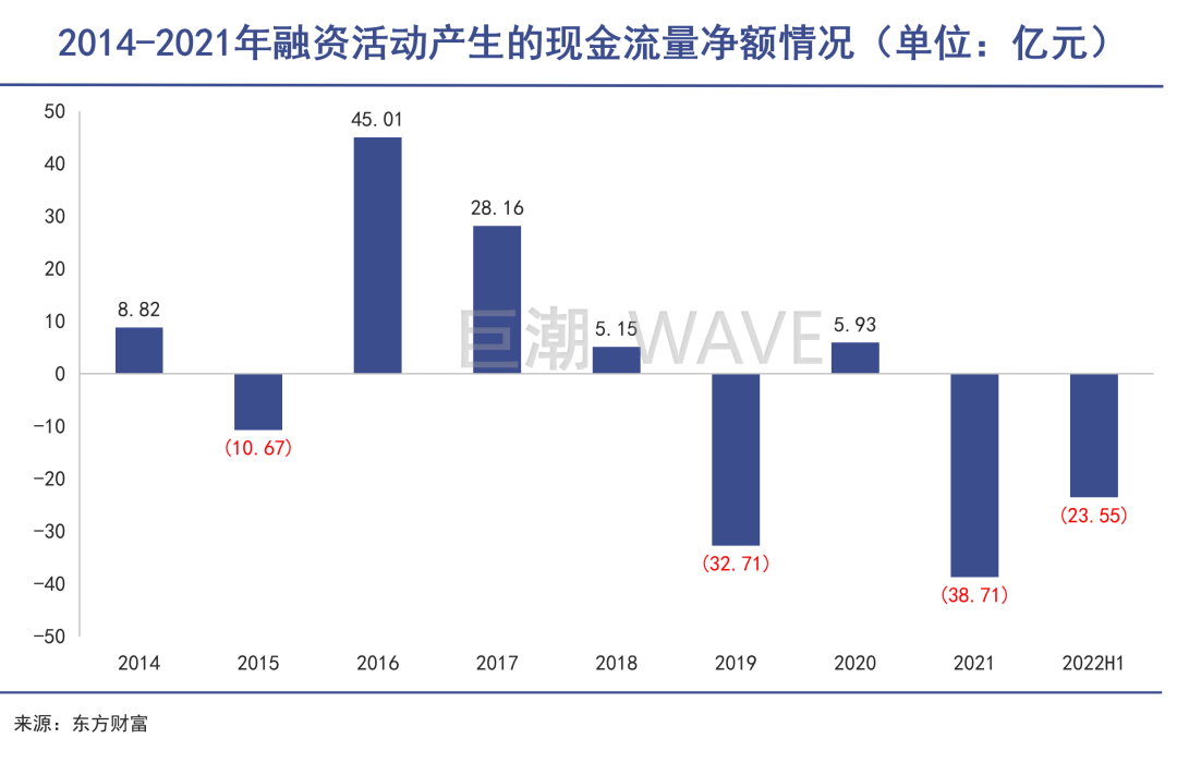 而根据近些年来国美零售融资活动产生的现金流量净额来看,仅在2016、2017年营收最高峰时,有过70多亿的融资现金流量净额,其余年份融资情况均不乐观。