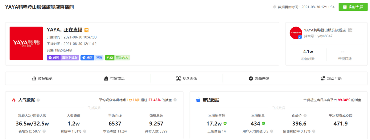 雪山直播前鸭鸭羽绒服的直播单场GMV几百元,直播后观看人次达36.5W。