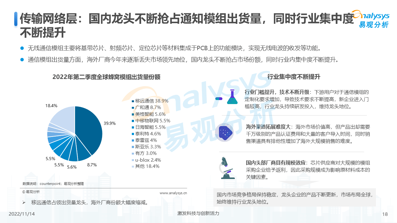厂商方面,华为、中移物联网、移远通信、拓邦股份等多个厂商积极研发,在关键技术上实现零的突破,国产化趋势明显。未来,物联网将围绕生产、生活等需求持续进行技术突破和新产品研发,进一步提高物联网的服务能力,满足未来越来越多的个性化需求。