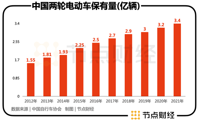 据企查查数据,我国有超22万家电动两轮车生产企业;据中国自行车协会统计,2021年我国电动两轮车社会保有量3.4亿辆,相当于每4个国人就拥有一辆“小电驴”,天花板清晰可见。