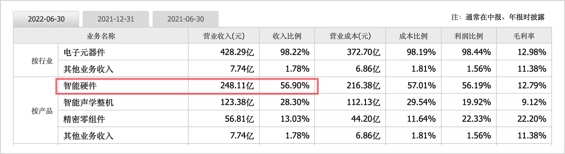 从2022上半年财报中,可以看出,以VR设备、游戏机等为主的智能硬件营收达到248亿元,占比上升至57%。与此同时,智能声学整机业务下滑至28%。