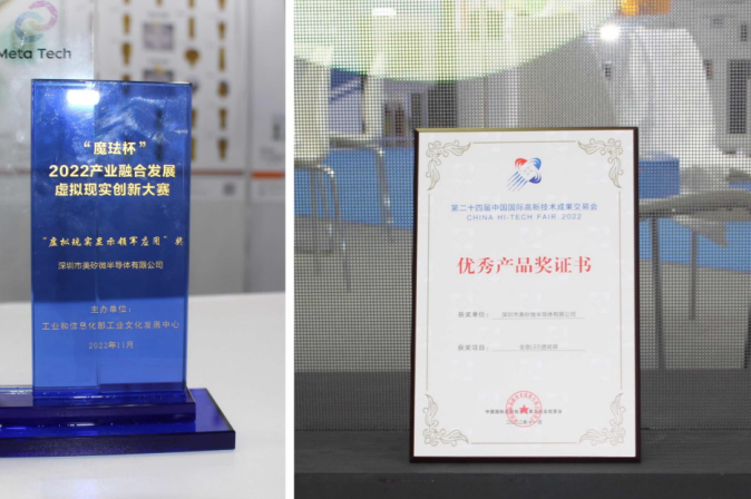 最新消息显示,美矽微“LED全息屏”获得了工信部工业文化发展中心主办的“魔珐杯”2022 产业融合发展——虚拟现实创新大赛总决赛一等奖和“虚拟现实显示领军应用”奖,同时获得了2022高交会世界元宇宙生态大会元宇宙(展示类)领军应用奖和二十四届高交会优秀产品奖。