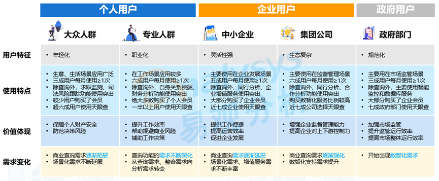 目前,商查的用户依据用户属性和对商查的使用深度和广度可以分为大众人群、专业人群、中小企业、集团公司和政府部门五类。其中大众人群和中小企业主要将商查应用在生活、生意场景,其需求逐渐拓展细化,未来需要商查平台提供更多的场景化服务、增值服务;专业人群、集团公司、政府部门更多将商查应用在工作、管理、监管场景,其需求不断深化,未来在深度分析、数智化方面的需求将越发强烈。