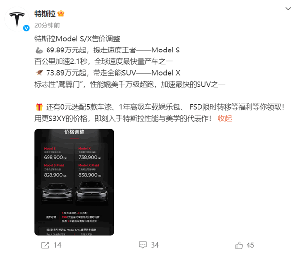 9月1日,特斯拉中国官方发布Model S/X调价政策:全新Model S售价69.89万元起,全新Model X售价73.89万元起。