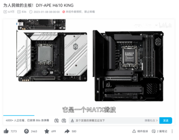 经过了一段时间的延期,这款主板终于发售了,名为 DIY-APE H610 KING,与“丐帮帮主”铭瑄合作开发。