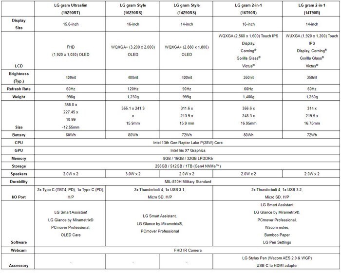 新款 LG Gram Style 推出了 14 和 16 两个新尺寸,长宽比为 16:10。16 英寸显示屏的分辨率为 3200 x 2000,刷新率为 120Hz;14 英寸显示屏的分辨率为 2880 x 1800,刷新率为 90Hz。该笔记本的具体参数如下: