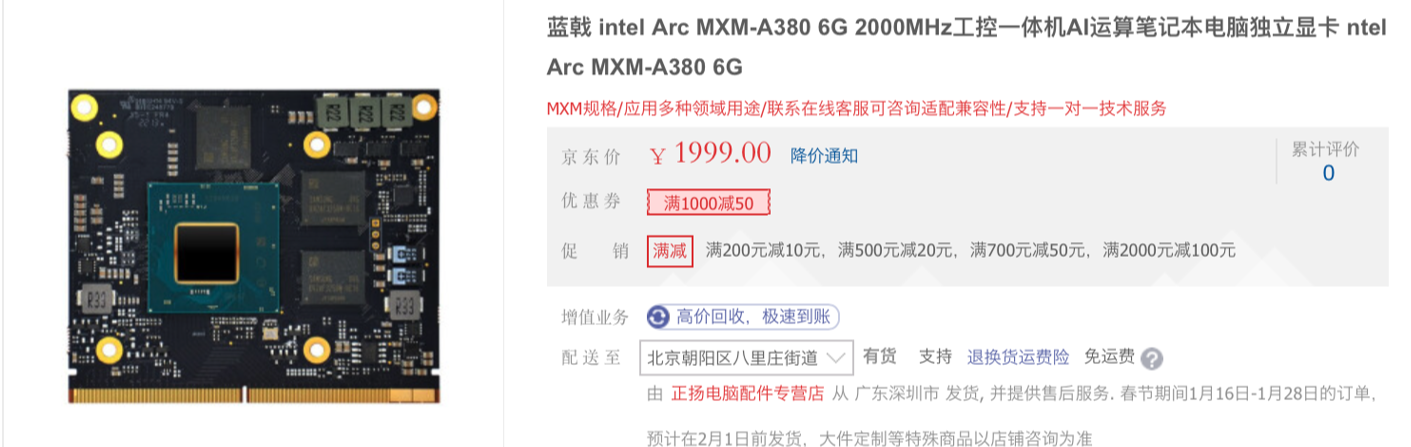 蓝戟英特尔锐炫 A380 MXM 显卡现已上架电商平台,标价 1999 元,可用于工业设备。