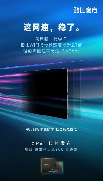 酷比魔方处获悉,X Pad 将采用新一代 WiFi,相比 WiFi 5 传输速度提升 2.7 倍,理论峰值速率高达 9.6Gbps 。另外该设备采用目标唤醒技术,低功耗更省电。该平板电脑还将全面采用 256GB 存储。