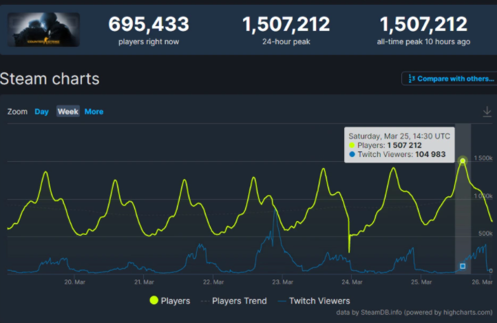 根据 SteamDB 数据,在 3 月 25 日晚 10:30 左右,Steam 上共有 1507212 人同时在线游玩《CS:GO》,创造了新的最高纪录,比之前的最高峰值高了 8 万左右。