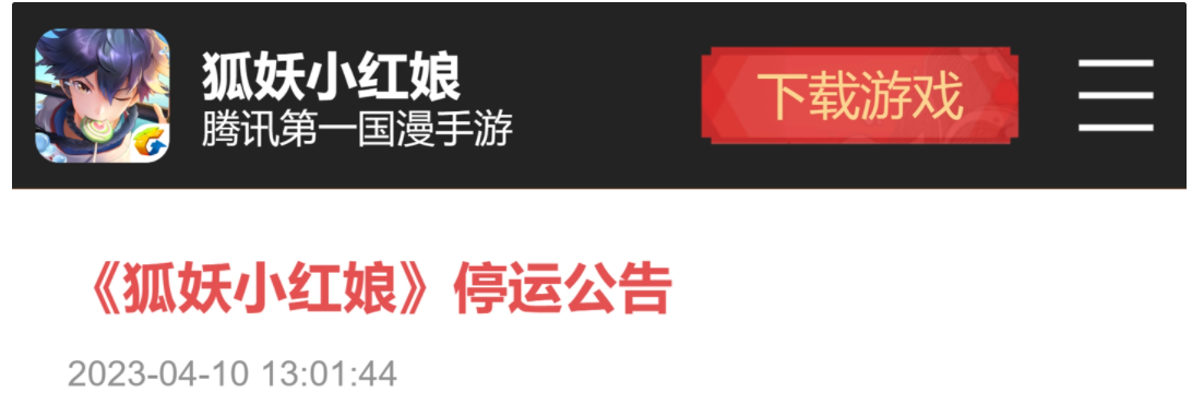 4 月 11 日消息报道 ,腾讯国漫 IP 手游《狐妖小红娘》于 4 月 10 日发布停运公告,由于游戏运营策略的调整,《狐妖小红娘》即将终止运营。