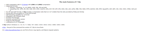 仅解压缩:ARJ,CAB, CHM,CPIO,CramFS,DEB,DMG,FAT,HFS,ISO,LZH,LZMA,MBR,MSI,NSIS,NTFS,RAR,RPM,SquashFS,UDF,VHD,WIM,XAR,Z。