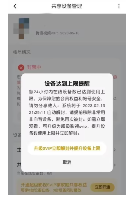 据悉,日前有网友反馈称,自己的腾讯视频账号登录了一台平板,三个手机,导致账号被封禁。(账号封禁期间平板和另一部手机并没有观看,只有两部手机在观看)根据平台提示:系统将于2023-02-13 21:25:11自动解封,请提前移除非常用非自有设备,避免再次被封。如需立即观看,可升级为超级影视svip,提升设备使用上限并立即解封。