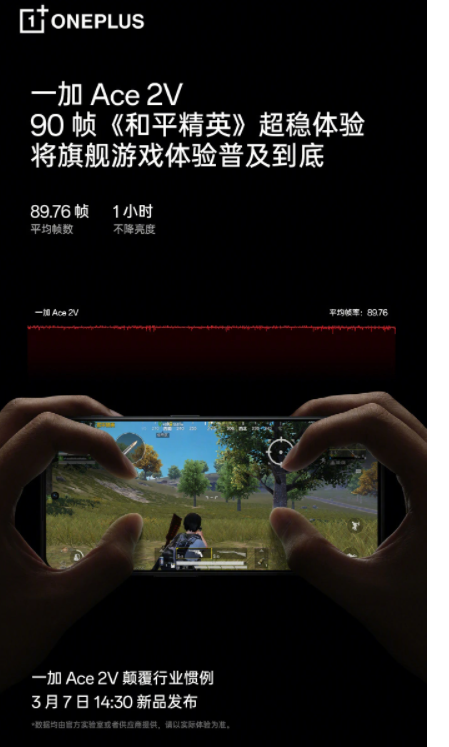 今天一加官方预热,一加 Ace 2V 手机支持《和平精英》90 帧模式,不降亮度一小时平均帧数 89.7 帧;还支持 120 帧《英雄联盟手游》,不降亮度一小时平均帧数 119.14 帧,接近满帧的稳帧、高帧体验。