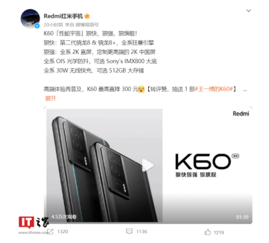 3 月 3 日消息报道,小米 Redmi K60 手机 512GB 版本于今年 2 月官宣降价 300 元,售价 2999 元起。现在小米商城、京东商城等 Redmi K60 手机部分 256GB 版本已开启限时优惠 300 元活动,活动时间是 3 月 3 日到 3 月 8 日,其中 12GB+256GB 到手价 2699 元,8GB+256GB 到手价 2599 元(注:闪降 100 元)。