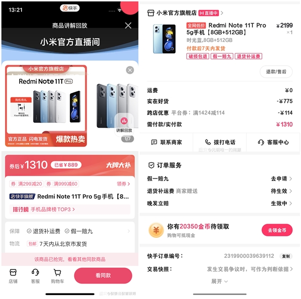 7月18日,在快手旗舰店内,Redmi Note 11T Pro 8+512G顶配版到手只要1310元,这个真香价引发米粉抢购,该机迅速被抢购一空。