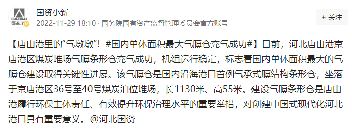 据“国资小新”《河北日报》等相关报道:唐山港京唐港区气膜仓作为国内单体面积最大且首例应用在沿海港口的气承式膜结构条形仓,是唐山港切实履行环保主体责任、有效提升环保治理水平的重要举措,对创建中国式现代化河北港口具有重要意义。
